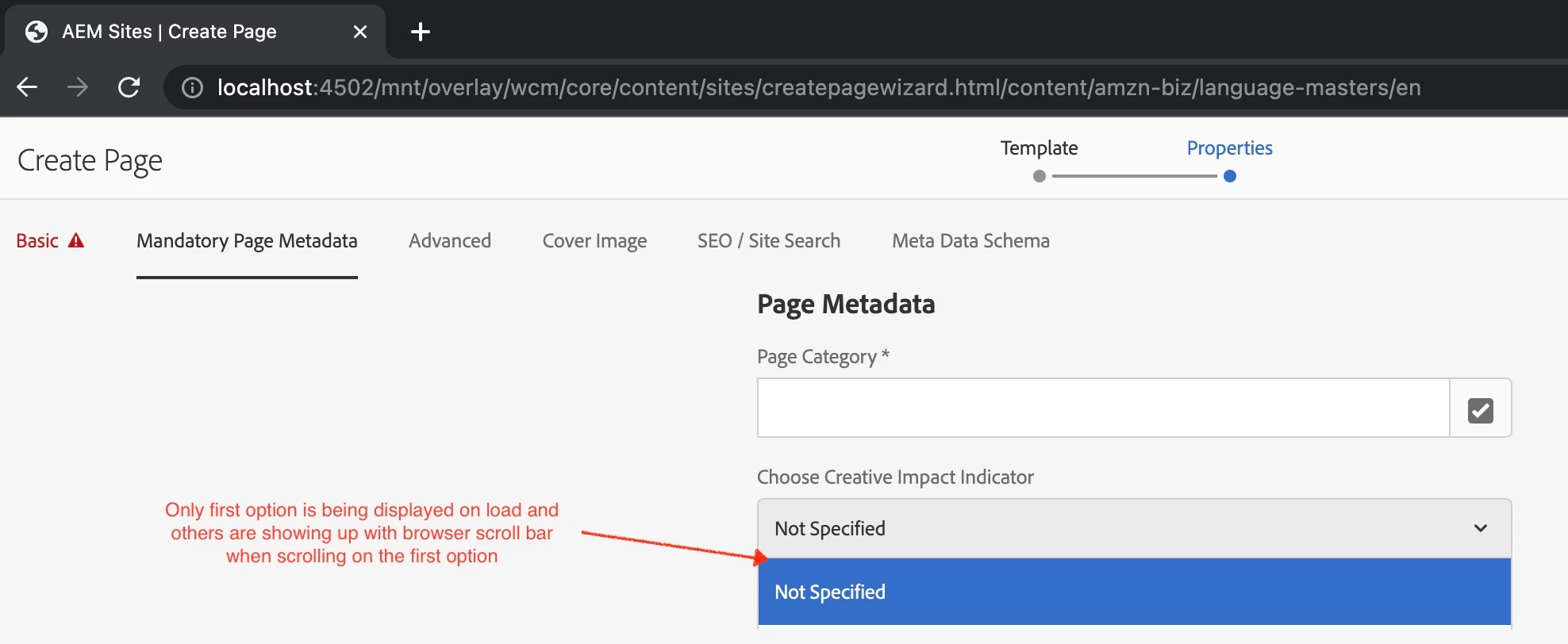 I am using AEM 6.5 (SP 10) and trying to include a select box in the page properties as per business requirement.  The select box is not show all options on click and creating vertical scroller on the browser. This behavior is confusing for authors while creating page, However the view is consistent when opening existing page props. Screen shots attached for reference and please suggest a work around to resolve this issue.