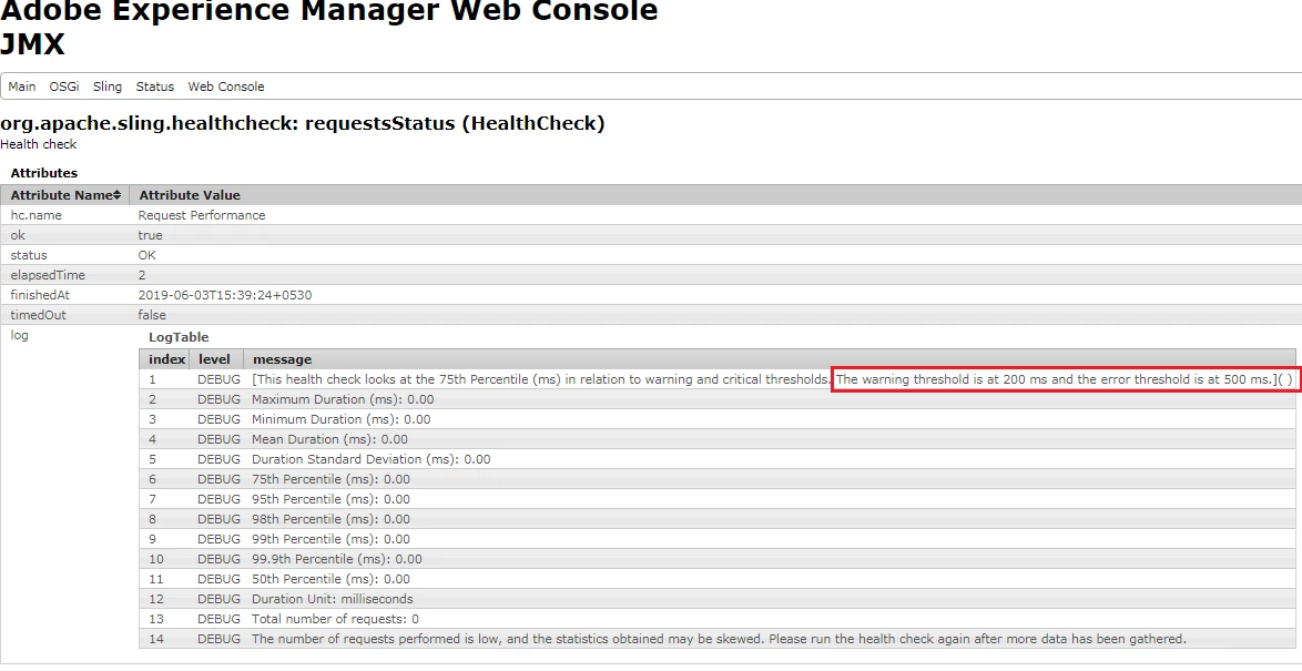 When i have checked JMX console for requestsStatus (HealthCheck), it shows This health check looks at the 75th Percentile (ms) in relation to warning and critical thresholds. The warning threshold is at 200 ms and the error threshold is at 500 ms.