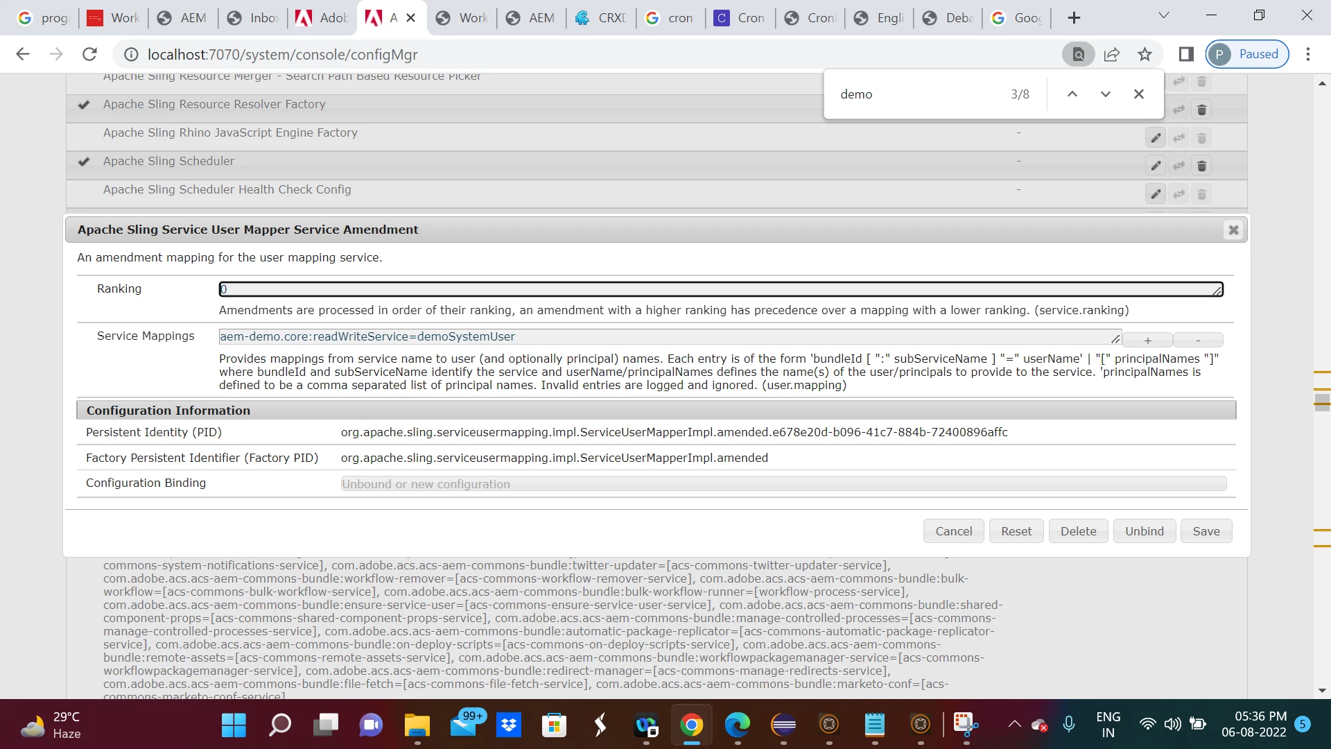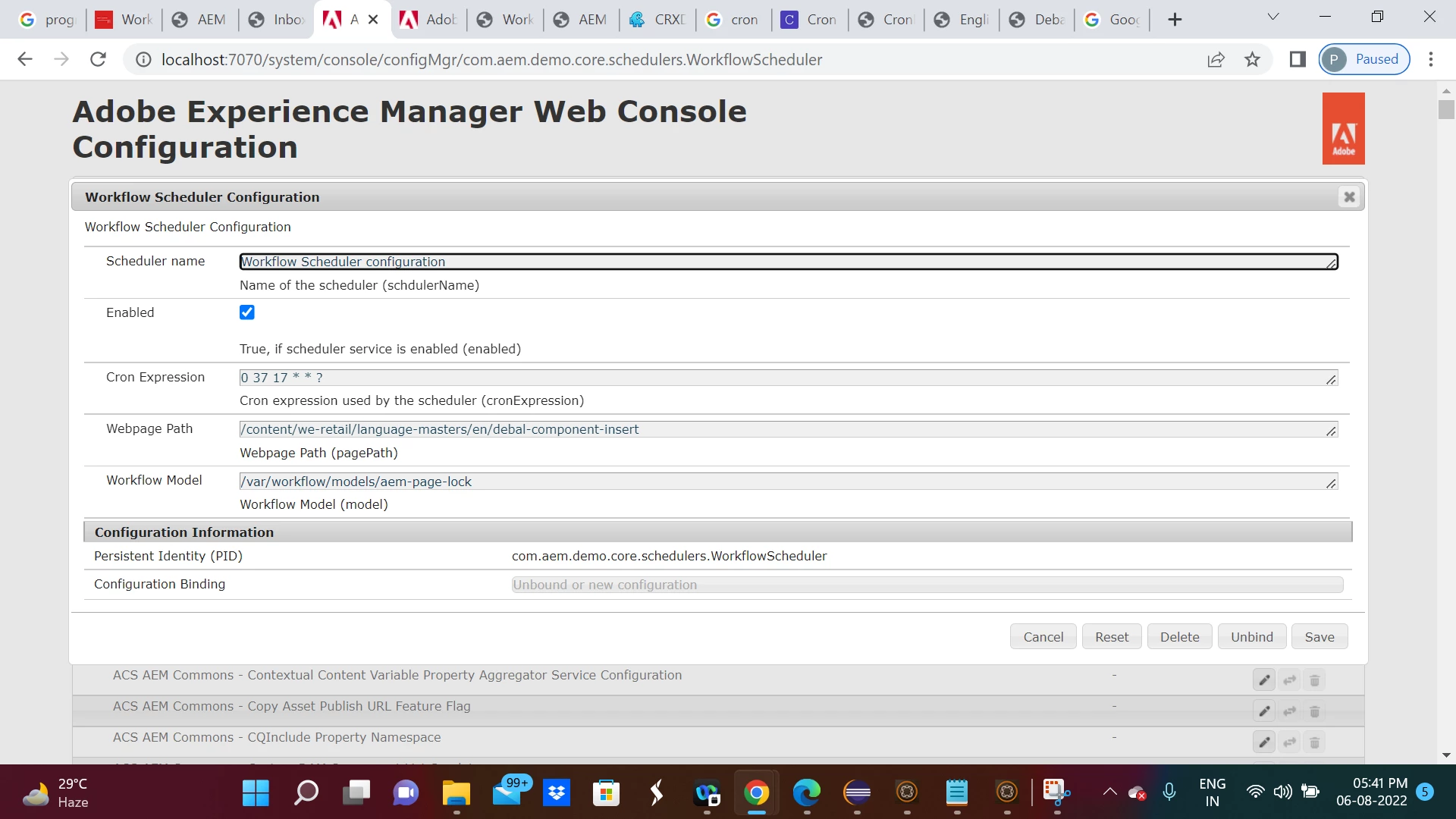 06.08.2022 17:37:00.225 *INFO* [sling-default-4-Workflow Scheduler configuration] com.aem.demo.core.schedulers.WorkflowScheduler ******Workflow Scheduler has been started ******AEM Page Lock
