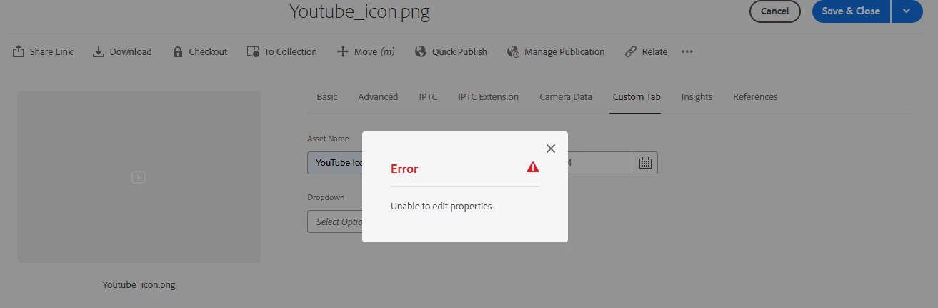 I have created a custom tab in Metadata of DAM assest, whenever i author the values and try to save its throwing error.