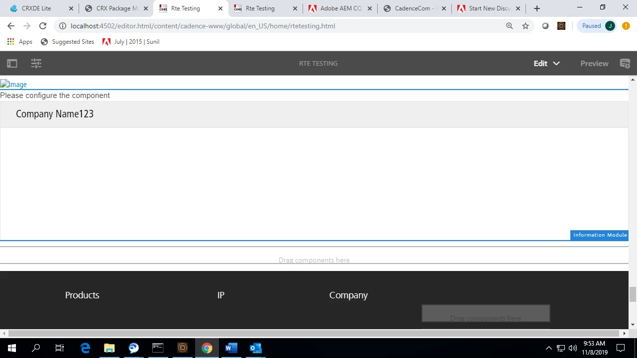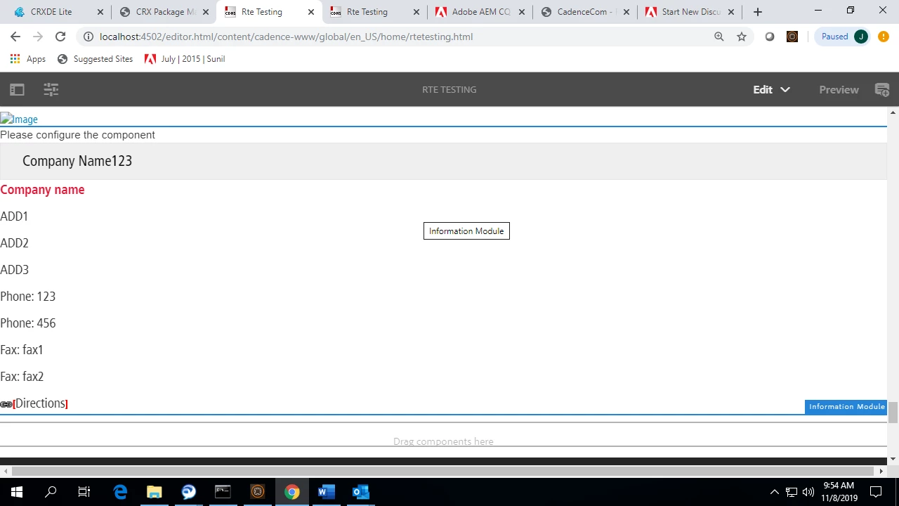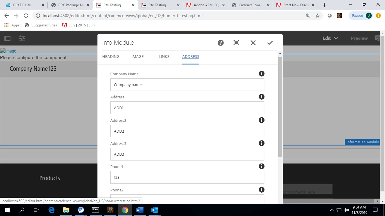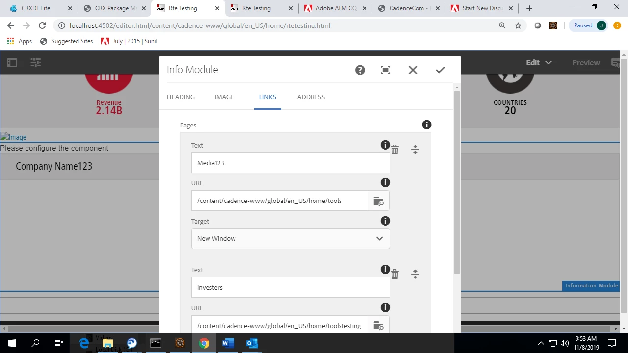 In one of the component information module, there is links tab where i authored some links which are not rendering on the page. those links are atored in crxde under /content folder. there are two dropdown options one is headquarter and another is contacts. when i select head quarters option and authored all the fields on address tab, they are rendering on the page.