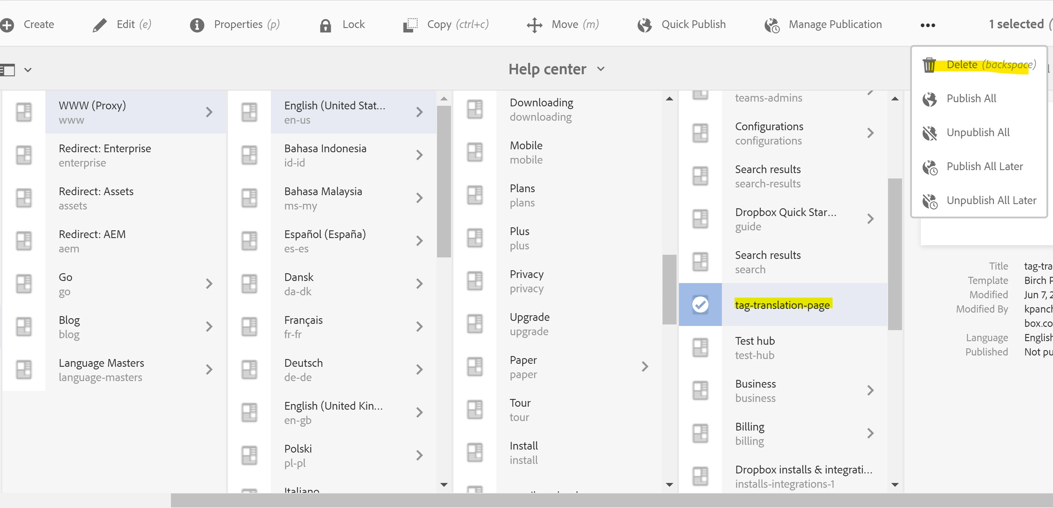 One page is missing the 'Delete' and 'move' option but all other pages have these options on the action bar. Does anyone know how this can happen or how these rights are inherited? I've included screenshots below. Any help greatly appreciated here!