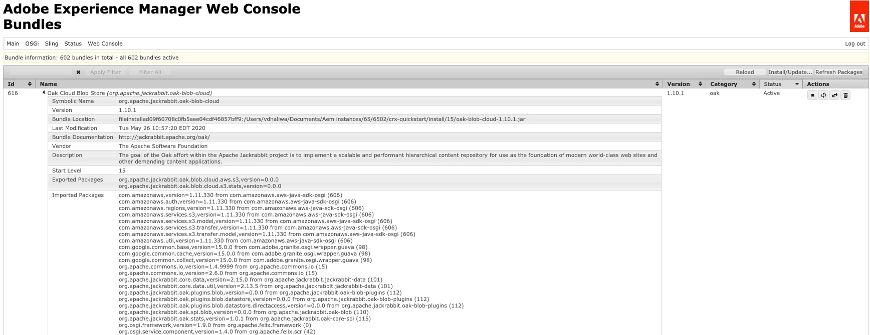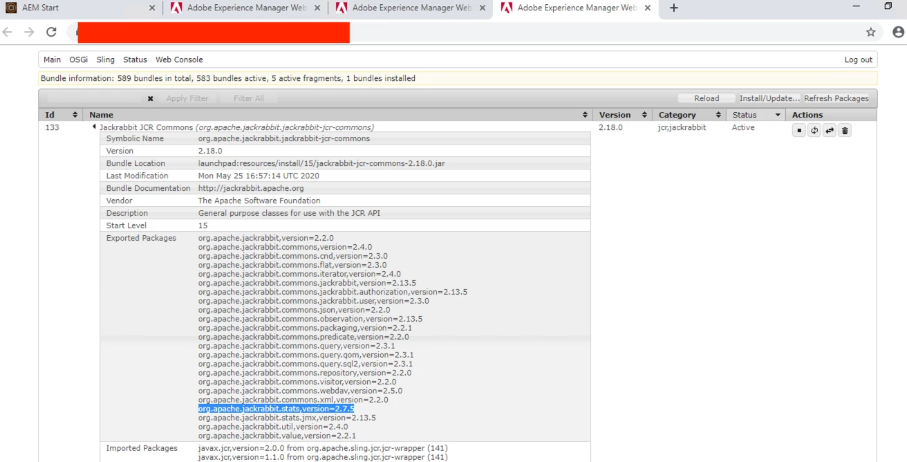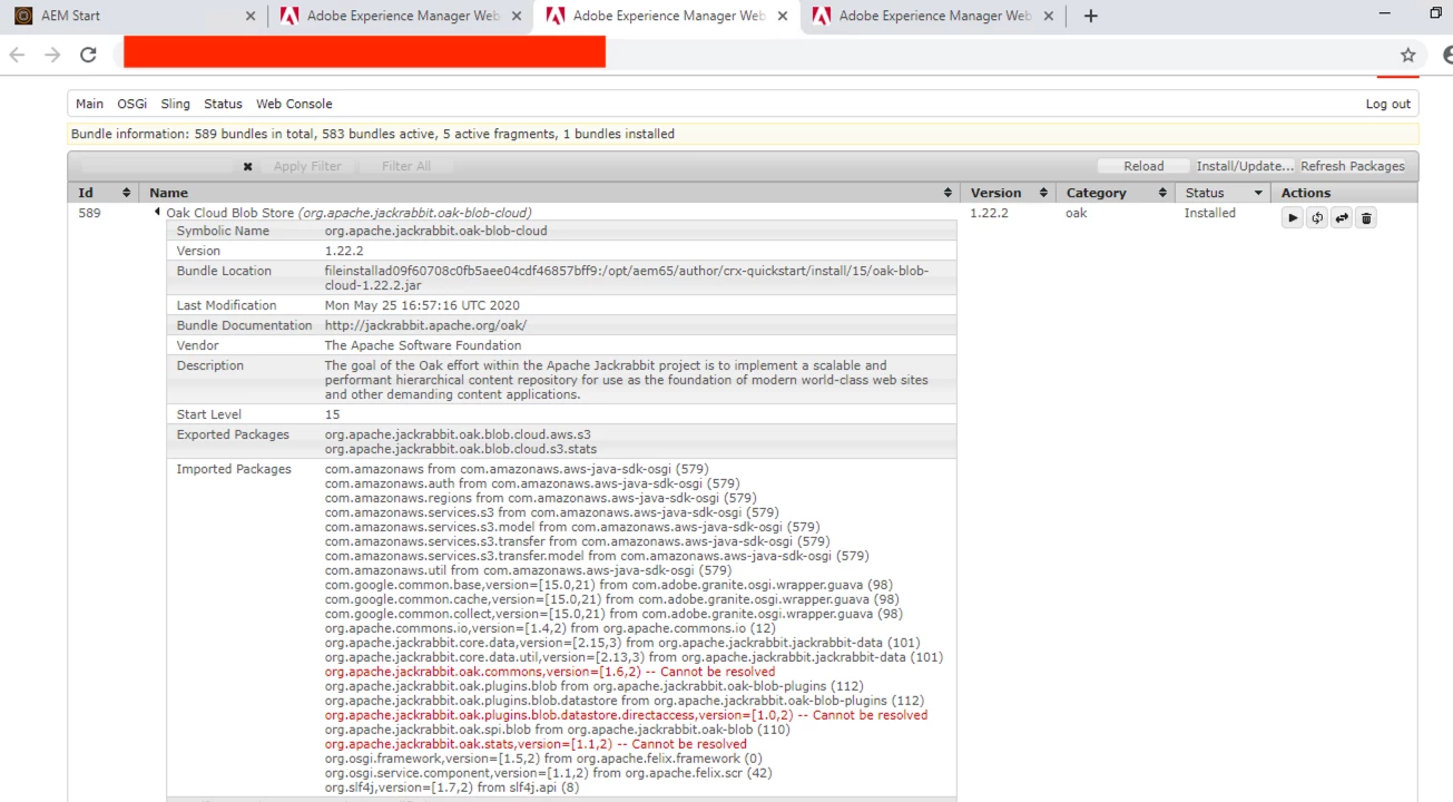 25.05.2020 16:57:31.772 *ERROR* [FelixDispatchQueue] org.apache.jackrabbit.oak-blob-cloud FrameworkEvent ERROR (org.osgi.framework.BundleException: Unable to resolve org.apache.jackrabbit.oak-blob-cloud [589](R 589.0): missing requirement [org.apache.jackrabbit.oak-blob-cloud [589](R 589.0)] osgi.wiring.package; (&(osgi.wiring.package=org.apache.jackrabbit.oak.commons)(version>=1.6.0)(!(version>=2.0.0))) Unresolved requirements: [[org.apache.jackrabbit.oak-blob-cloud [589](R 589.0)] osgi.wiring.package; (&(osgi.wiring.package=org.apache.jackrabbit.oak.commons)(version>=1.6.0)(!(version>=2.0.0)))])