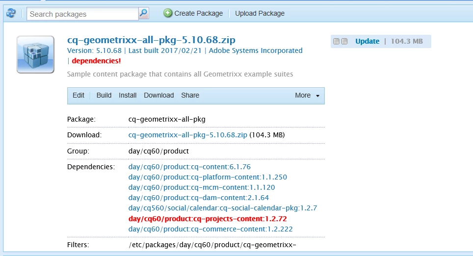 I'm trying to install package "cq-geometrixx-all-pkg-5.10.68" through CRX and it throws me an error saying the following product have dependency,