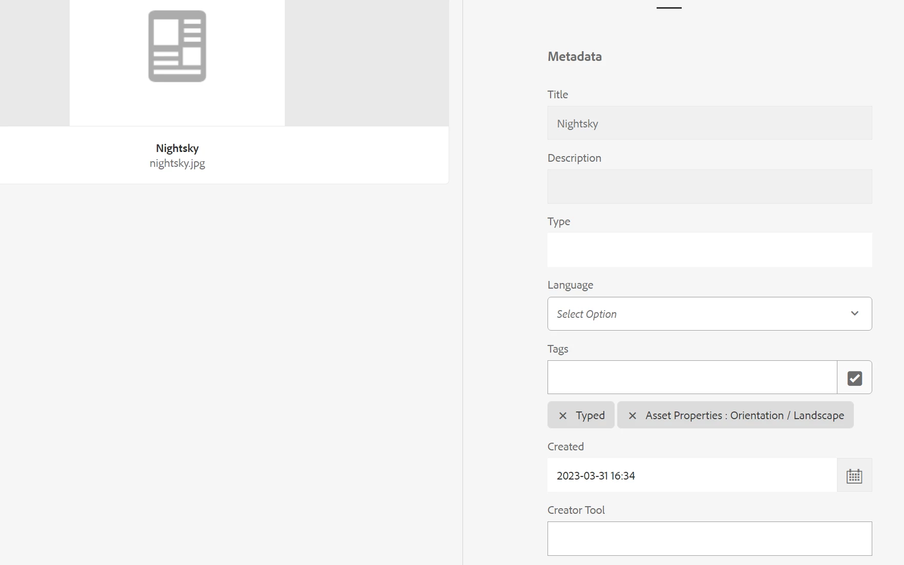 As shown below in the screenshot, the value for the Tags field has two values. "Typed" is the value being hand-typed whereas "Asset Properties: Orientation / Landscape" is the value being selected from the tags screen after clicking the check mark button.