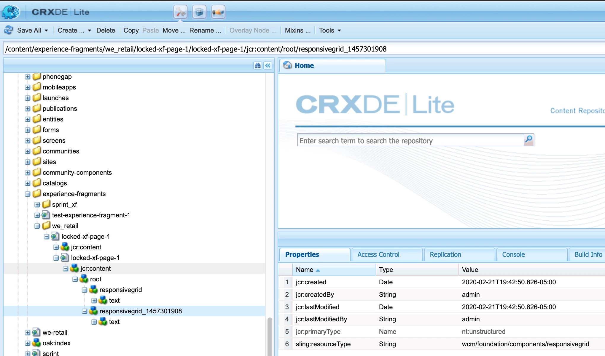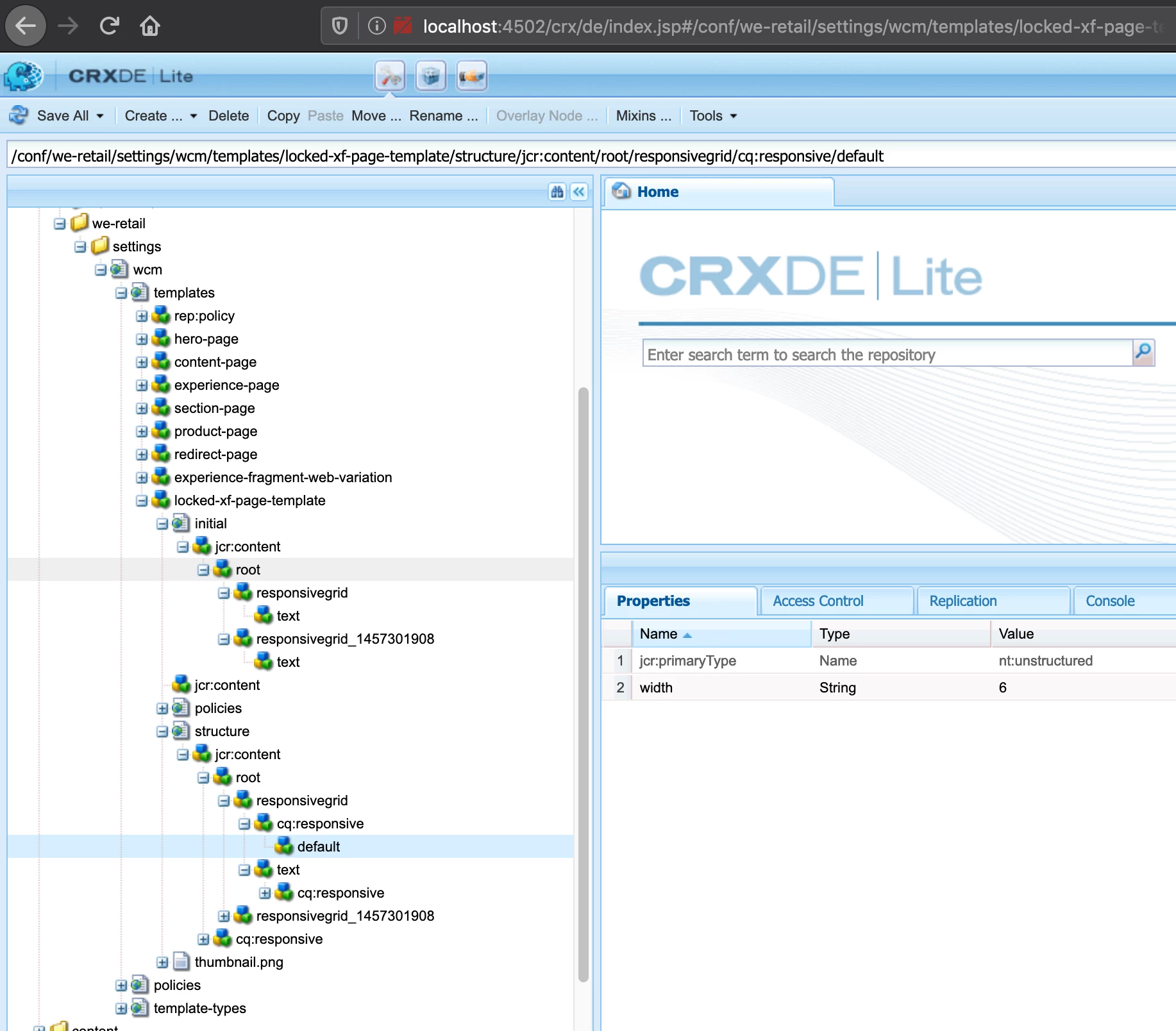 3. Notice "cq:responsive" node under structure of XF page template. But no such node under "Intial" area of that template or actual content of that XF page created from the template
