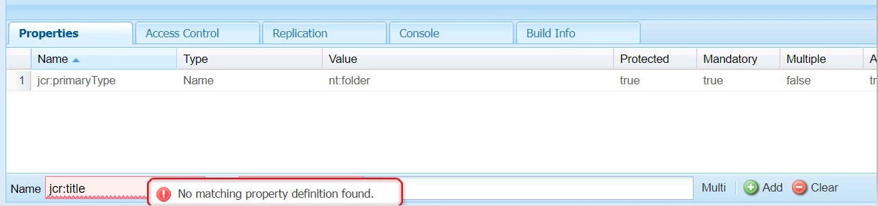 Jackrabbit- Property is not allowed in node with potential default types [nt:folder]