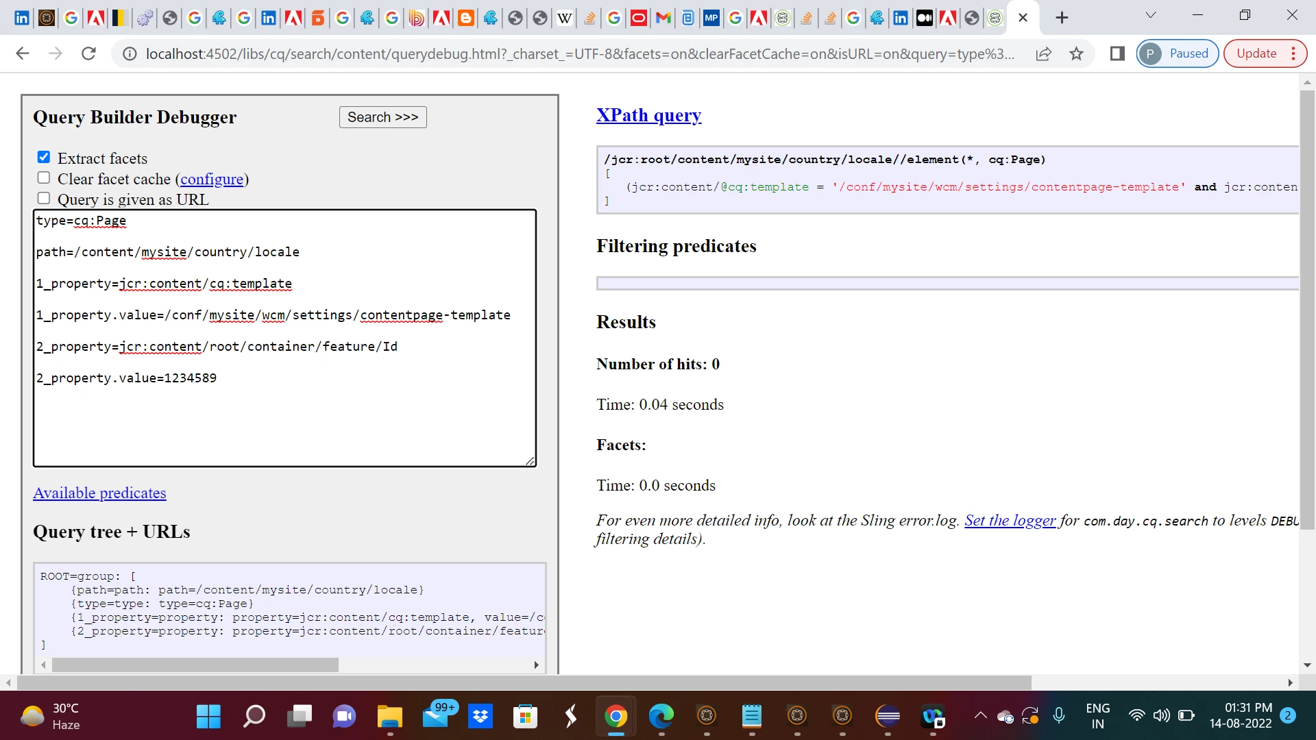 Step 1: Use AEM query builder debugger url http://localhost:4502/libs/cq/search/content/querydebug.html to generate xpath query as shown below -