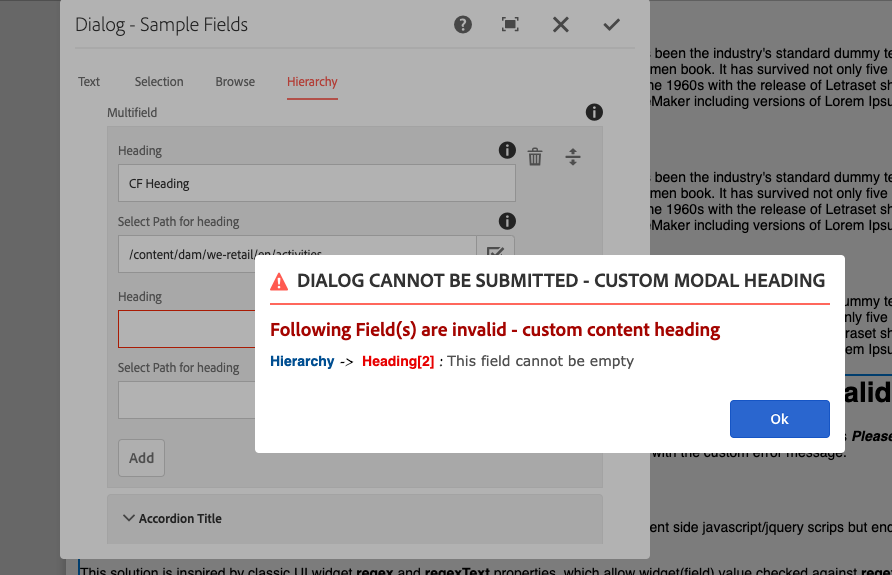 I have a multified (say, list) and within that there's a textfield (say, title) which is set as required. Now if a user adds too many multifield section(say, product1, product2, product3) and then collapses all the sections. he filled in title field in product1 and product3 and missed to fill in 1 title in produc2, then if he tries to close the dialog box, he will not be able to close the dialog box, because title is a mandatory field and it is not filled. Also at the same time since all the multifields are in collapsed, he wouldn't know in which multifield section he is having the issue. He would have to expand all the multifield sections to find out, which one is having issue. is there anyway to deal with this, so that the user knows exactly under which multifield product is the issue?