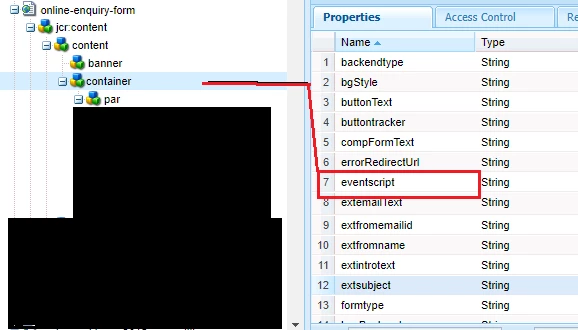 Note: There are 1000 of subpages under the cq:Page /content/sample-bank/personal/form which could have or don't have the property eventscript in the node /jcr:content/content/container
