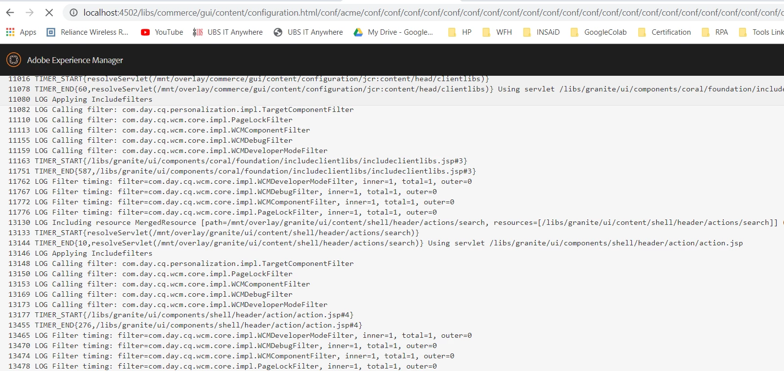 But when I am looking for CIF Configurations console it is not working, it is running in an infinite loop and keep on adding conf with the requested URL: loclahost:4502/libs/commerce/gui/content/configuration.html/conf/acme