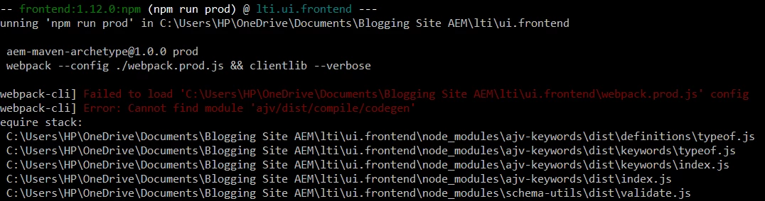 Change directory to ui.frontend folder and run following command to make sure all node dependencies are installed and there are no error