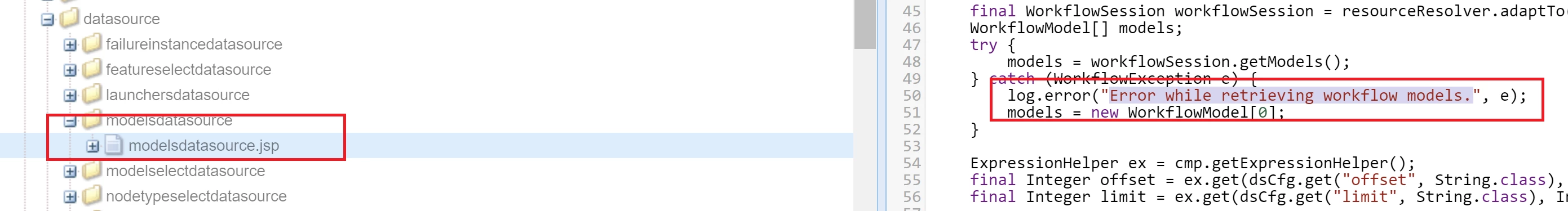 Given that problem is in Touch UI alone, per the logic you should see a log message in error.log - "Error while retrieving workflow models." (Screenshot below)