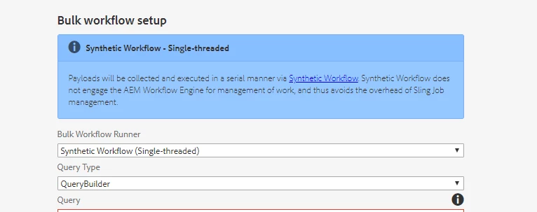 I'm having some issues with getting a workflow to execute properly using ACS Bulk Workflower manager when selecting "Synthetic Workflow" (I've previously been taught, that this mode is preferable over the standard AEM workflow). The workflow should delete assets, but doesn't when I use "Synthetic Workflow".
