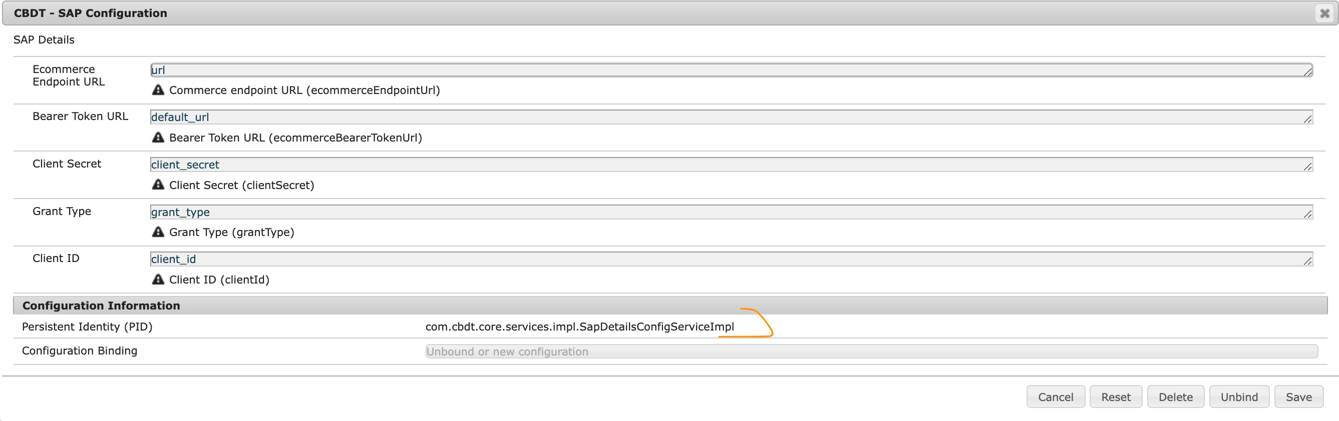 2. When your configuration file name is not correct. By default, it must be a full reference to your impl class, in your case I think `com.cbdt.core.services.impl.SapDetailsConfigServiceImpl.cfg.json`