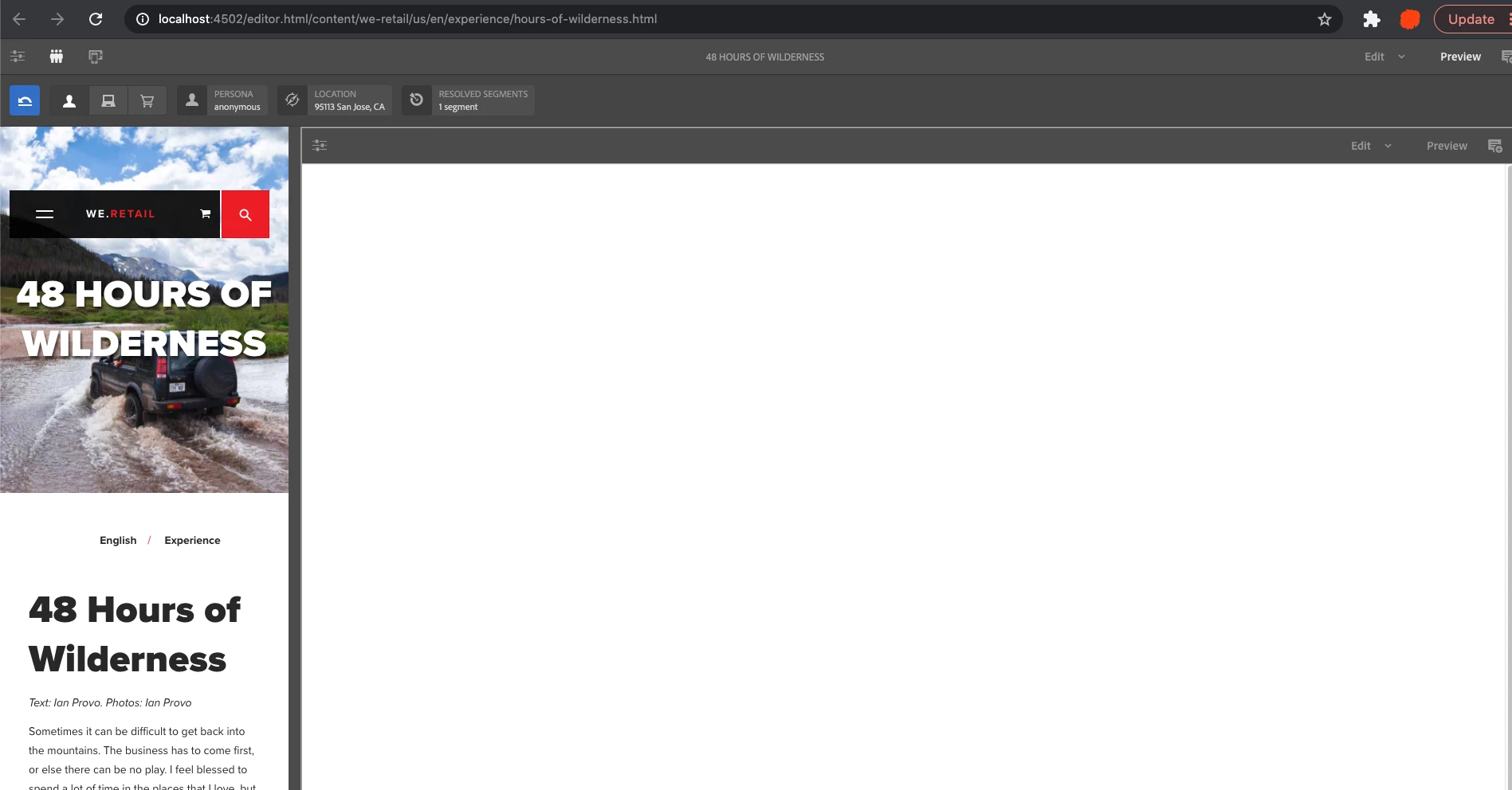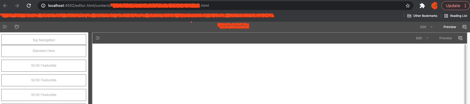 When I try to open any page in Preview mode on my local Author instance, it gives me below error in error.log and I get two title bars as shown in screenshot for any page on my site. I also tried to preview a page from we-retail and it looks left shifted as per the screenshot. Any help would be appreciated. Thanks in advance!