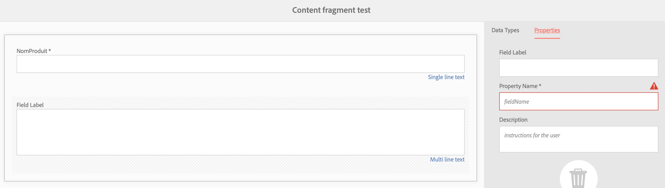 When creating a content fragment model, the data types "multi line text", “number field” and "enumeration" are missing the following properties: