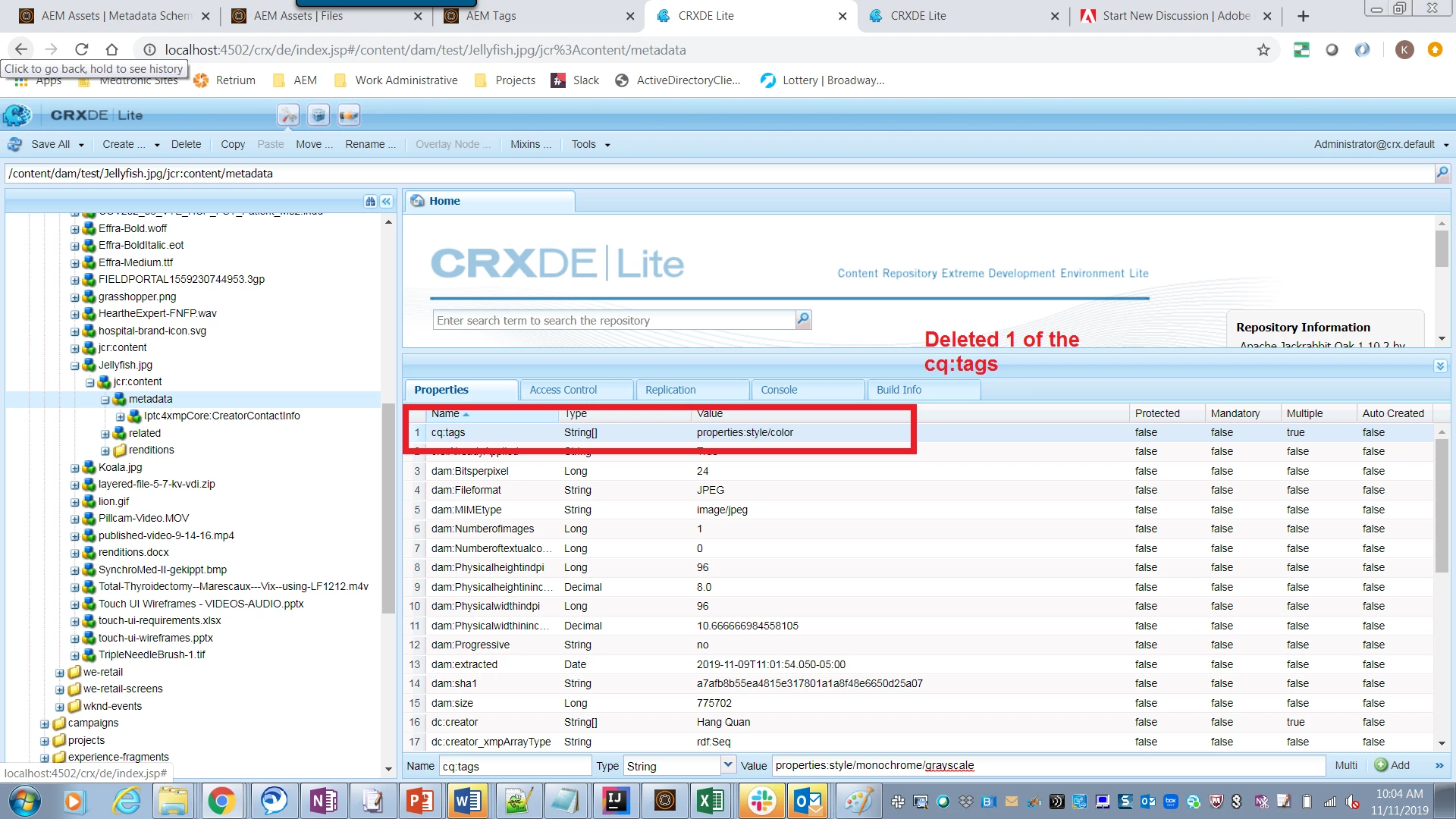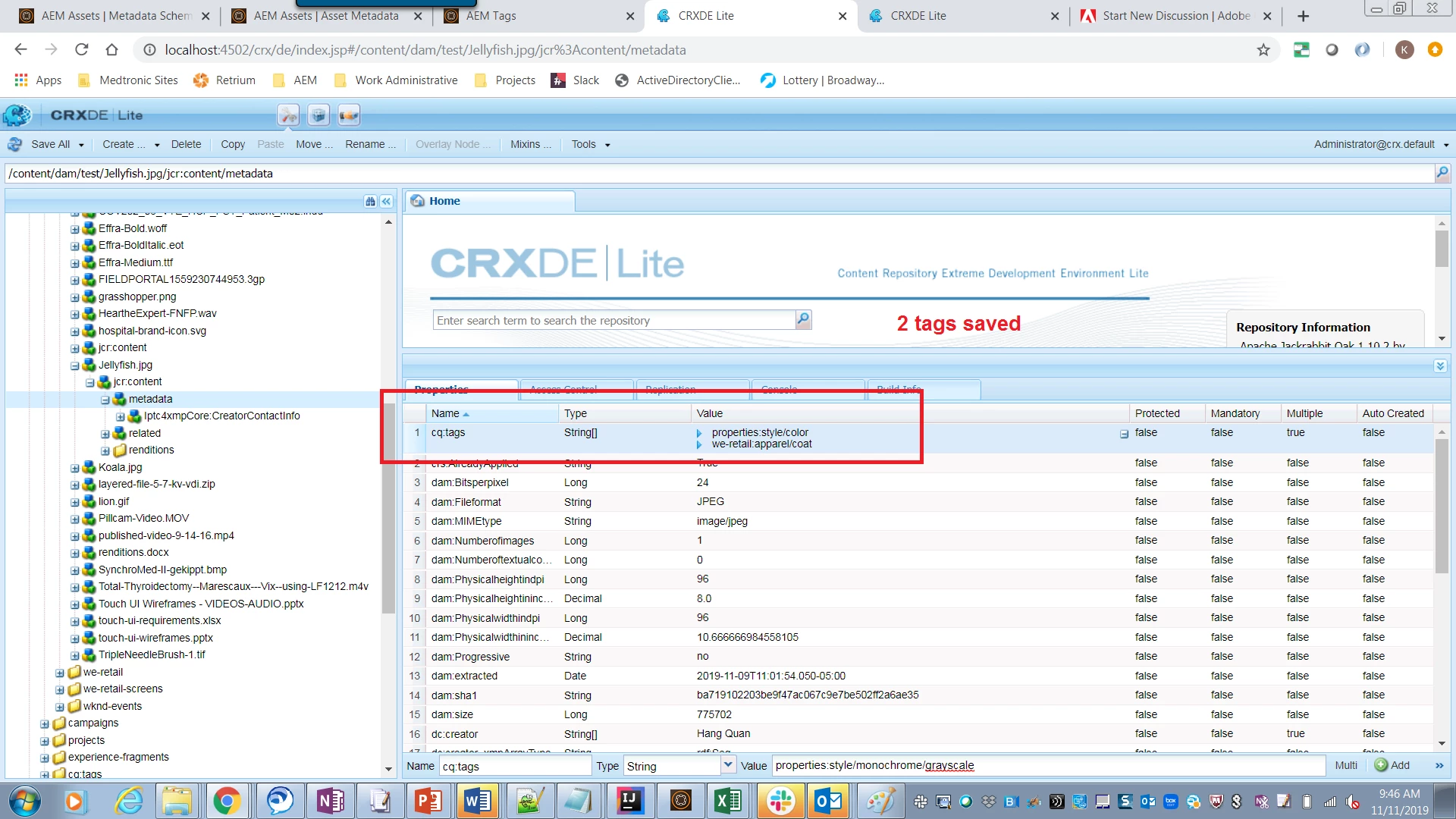 3. Upon saving after authoring the "myTags" field above, 1 of the tags I had previously authored in cq:tags is deleted: