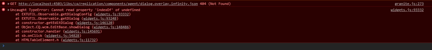 I have the following issue: when I click on "edit" in any replication agent on publish instances (on author works fine), the configurable dialog doesn't appear and there is the message in the console: