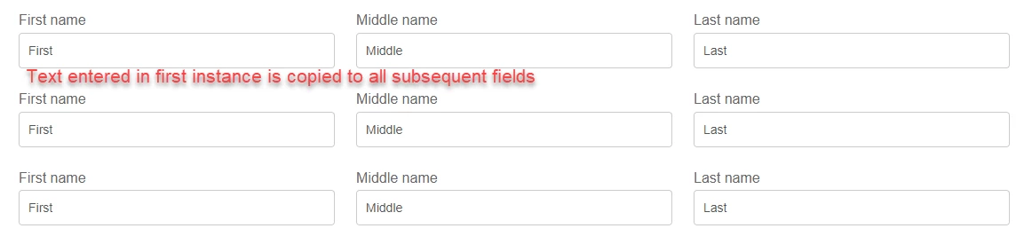 We've created a few fragments that we'd like to use several times within the same form. Unfortunately when the fields are filled out, the data from the first fragment is copied into all subsequent fragments. I thought that maybe changing the binding for each instance would fix it but that doesn't seem to matter.