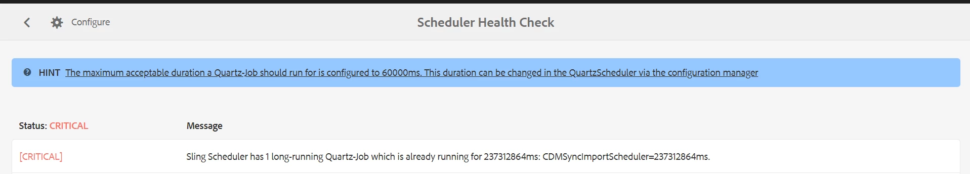 We have created Scheduler called CDMImportScheduler in AEM6.5.CDMImportScheduler is not getting triggered now. We are seeing in CDMImportScheduler is running very long in "Scheduler Health Check ".