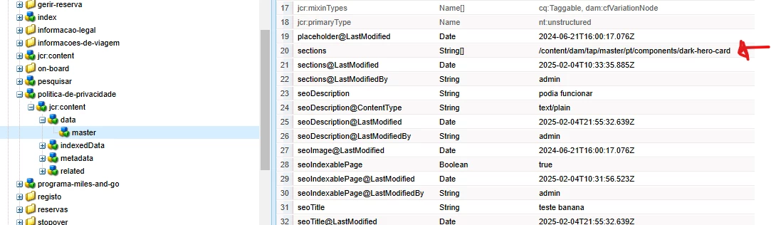 It should have this path (/content/dam/tap/master/pt/pages/politica-de-privacidade/jcr:content/data/master) as a result because the word "holidays" exists within the content fragment (/content/dam/tap/master/pt/components/dark-hero-card) that is being referenced in the properties (ex: sections: ) of the content fragment (/content/dam/tap/master/pt/pages/politica-de-privacidade/jcr:content/data/master)