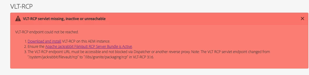 We're trying to set up AEM-ACS VLT-RCP on our AEM author instances. We've installed the latest version of the org.apache.jackrabbit.vault.rcp and verified that the Apache Jackrabbit FileVault RCP Server Bundle is Active. However we keep getting this error when we navigate to http://localhost:4502/etc/acs-tools/vlt-rcp.html.