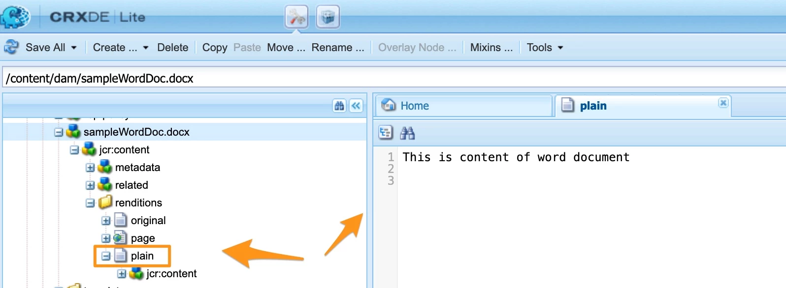 So in that case, you can try url like this: http://localhost:4502/api/assets/wordFile.docx/renditions/plain