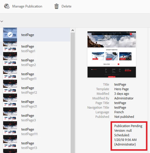 - Publish page using publish later option and select a page on sites console it shows properties of the page like below screenshot.