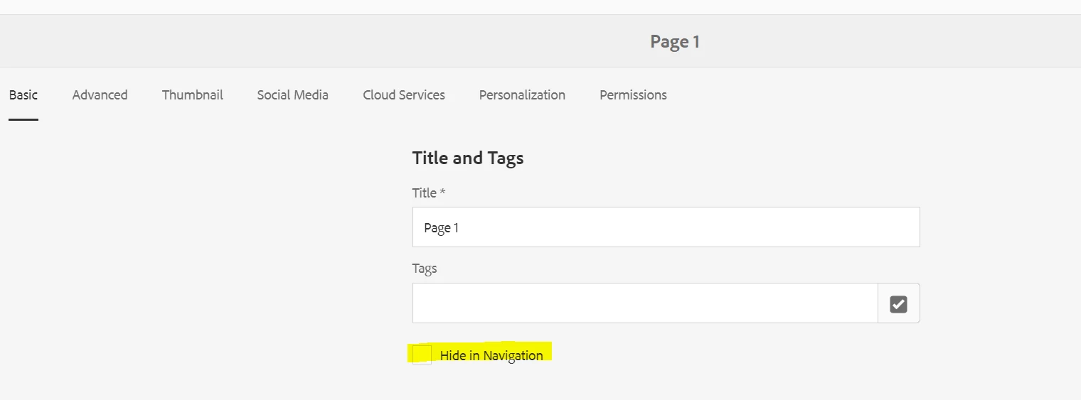 There is one hide-in navigation checkbox present in the page properties dialog. I want it to be visible while creating the page and always remain checked. But when I go to the core component basic tab there is no option to overlay how can I achieve that.