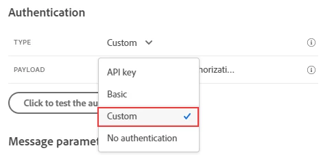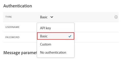 Message Parameters: the values may depend on your use case. Below is an example.