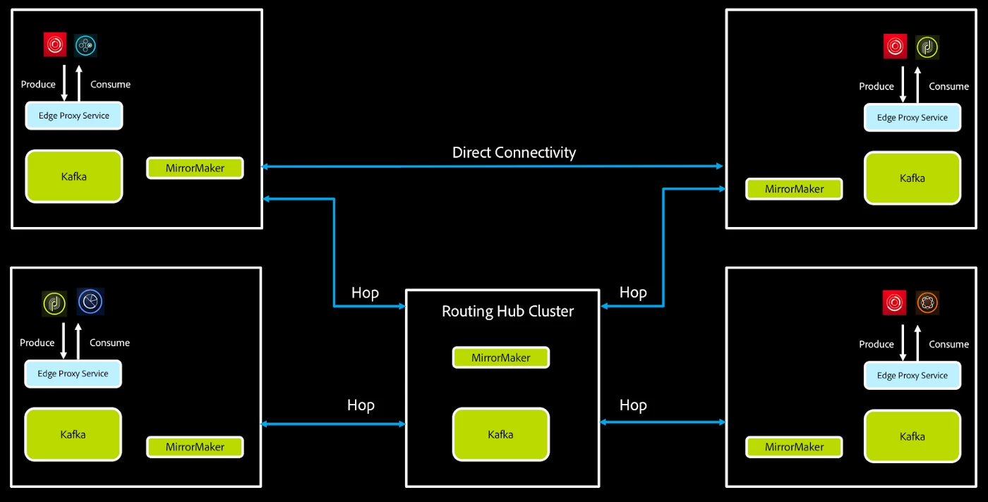 We achieve routing by producing messages to appropriate topics that are mirrored across data centers. We use MirrorMaker to achieve this. As we add more data centers, the number of MirrorMaker clusters required for complete graph connectivity (in other words, every data center connecting directly with every other data center) grows exponentially. This, while neat, is not a scalable solution. Many companies that operate Kafka clusters at a large scale face this issue. One way of solving the problem is to introduce a “hop cluster" to route messages and reduce the number of directly connected data center nodes. Other options are using a different mirroring solution than MirrorMaker, such as Confluent Replicator.