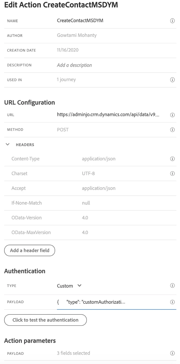 9. Add the fields which you would like to send as part of the POST request like firstName, lastName, emailaddress1, job title, etc in the Action parameters section. Refer to sample payload here.