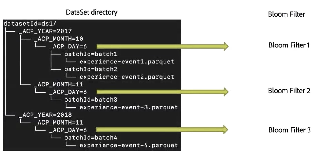 To illustrate how this bloom filter operates in Adobe Experience Platform, we used an Experience Event dataset. The image below shows the layout of this dataset, in which names with the suffix .parquet are representing files and names starting with datasetId or ACP represent directories.