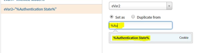 The rules editor in DTM features data elements search suggestions and autocomplete: