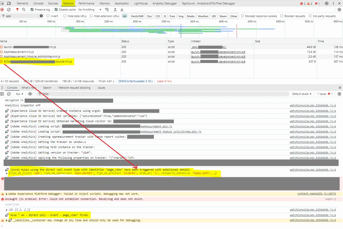 here I reloaded the page and the CORE extension did not recognize the page_view event