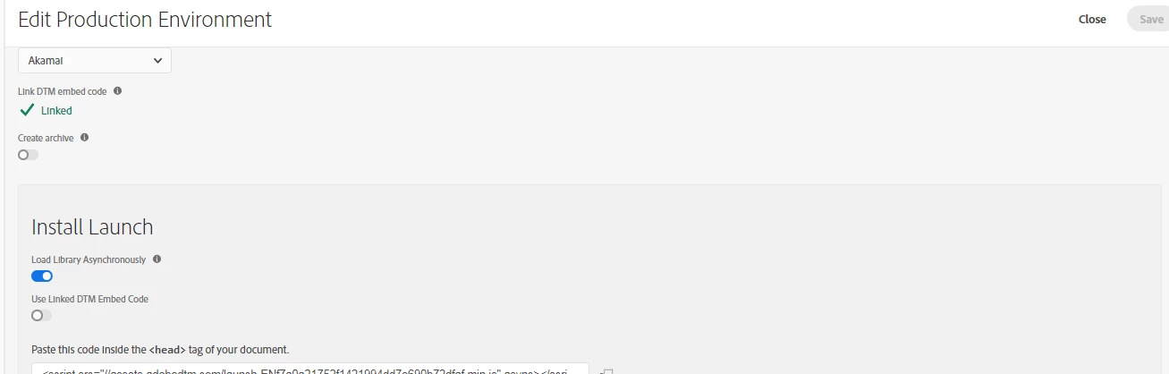 After I created the prduction environment which is linked to DTM embed code. Under Install Launch I turned on Use Linked DTM Embed Code, obviously. But it would not allow me to save the the change, then I selected crate archive and then deselected it just to have the save button to turn blue and then I clicked on Save.