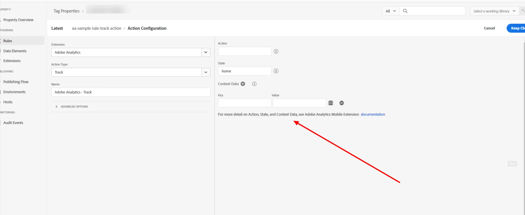 I have above interface where I can send the Adobe Analytics trackState and trackAction values. But, I am not able to find, where can I map those to eVars and props