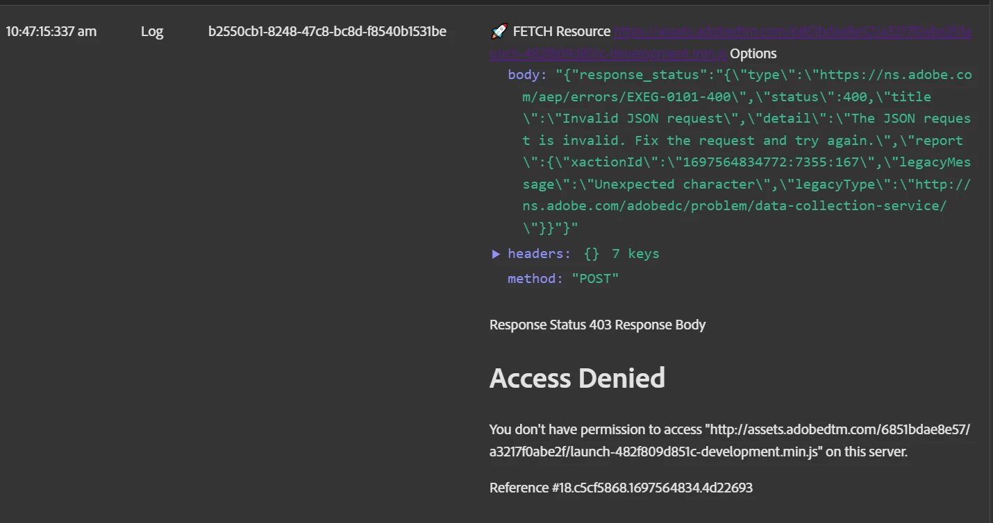 I am trying to send a response status from one of the Ajax request in Event Forwarding Property back to Adobe Launch Tag Property, but throwing this error below: