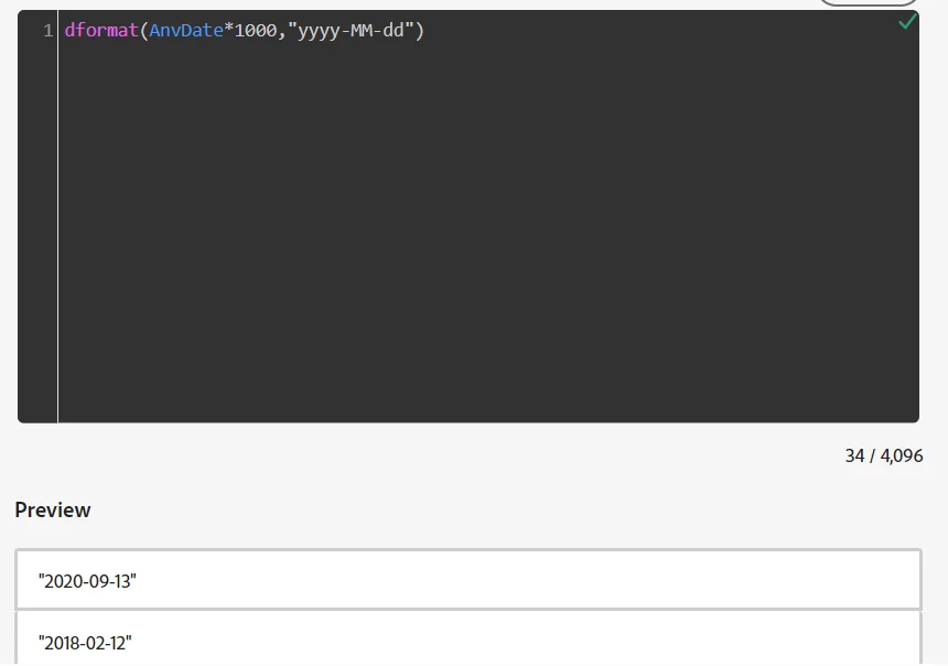 Hi All, I'm facing issue while converting unix timestamp to date field. here im using dformat for conversion and im getting only null values, but if i use specific timestamp like this -1652246442000 instead of "AnnivesaryDate" its showing me the correct result