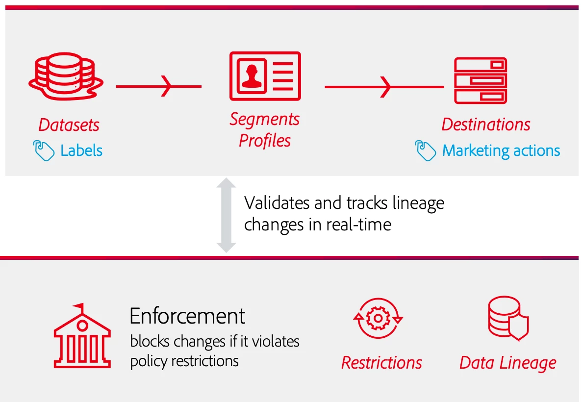 In Experience Platform, policy enforcement is concerned with the following lineage: