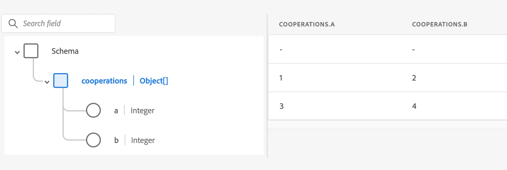 Basically, we have object array fields where the size is not fixed, and in some (most) rows of data, the array is empty. Here is a simplified example.