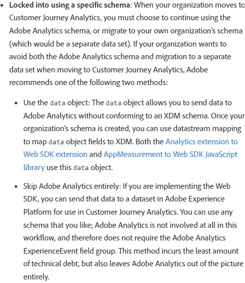 We are in process of Switching our App measurement code into AEP Web SDK and send data to Adobe Analytics (Use the same Schema and share data with AEP Data Lake in near future). And I see in one of the articles, adobe have mentioned that using default Adobe analytics experience event schema can create confusion for data admins or architects and it also make it difficult to use other platform services such as Adobe journey optimizer or Real - Time Customer Data Platform.
