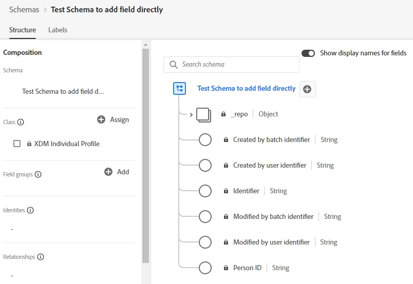 In the screenshot below, I have 6 in-built fields fetched from XDM Individual Profile Class, I want a field called 'XYZ' as the 7th field in this schema (without adding it in a fieldgroup or associated class). Please let me know if this can be achieved.