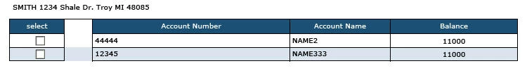 And a run time view of the table. You can see the radio is hidden, but the "account number" column wants to squish into the (hidden) radio column,