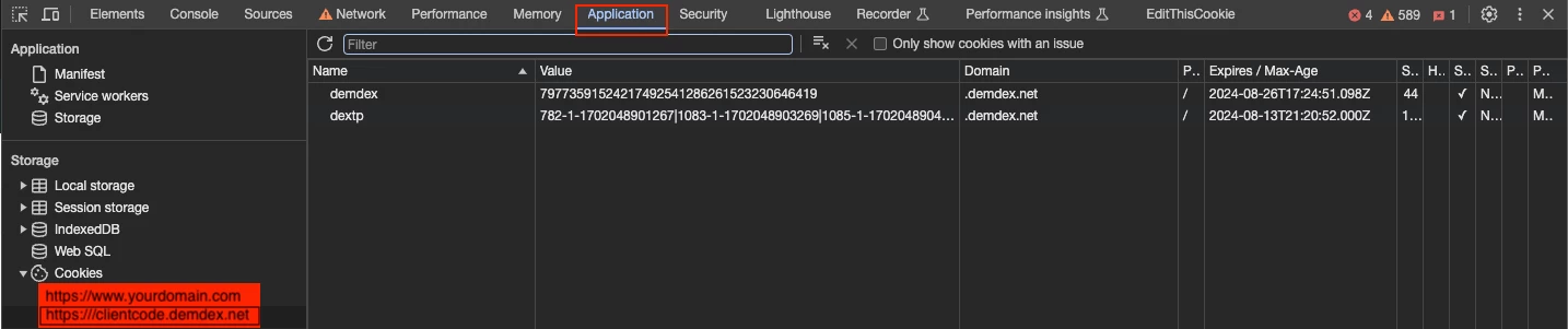 You can view Target cookies set on your machine by opening your browser's developer console on a page running Target and navigating to Application > Cookies (dropdown menu) > yourdomain.com(AMCV, AMCVS, mbox, and at_check, potentially along with: mboxEdgeCluster, customerclientcode!mboxPC, and customerclientcode!mboxSession depending on your implementation) or clientcode.demdex.net (demdex):