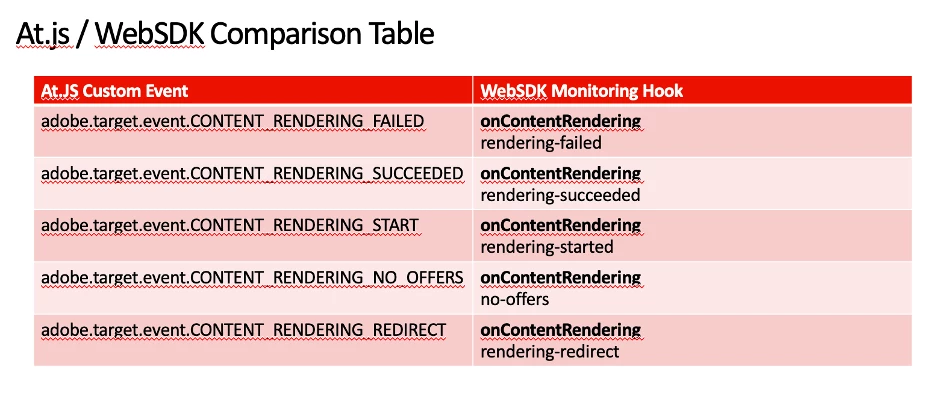 The good news is that the product team has developed an equivalent feature for WebSDK, these are called monitoring hooks. Naturally the first question that comes to mind is what are the equivalent monitoring hooks compared to the at.js custom events?
