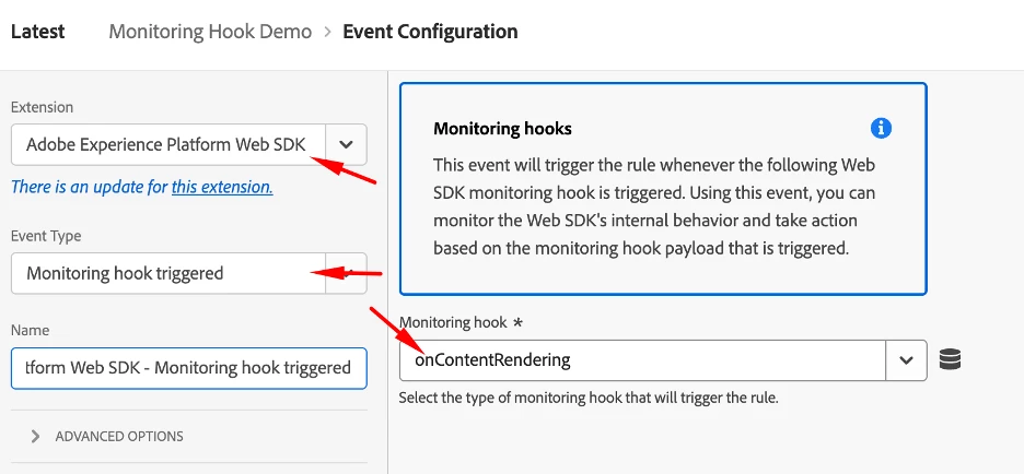 First let’s create a new rule called ‘Monitoring Hooks – Demo’. For the event we’re going to use the ‘Adobe Experience Platform Web SDK’ extension and the event type is called ‘Monitoring Hook triggered’. For this simple demo we’re going to use the ‘onContentRendering’ monitoring hook so make sure to select that.
