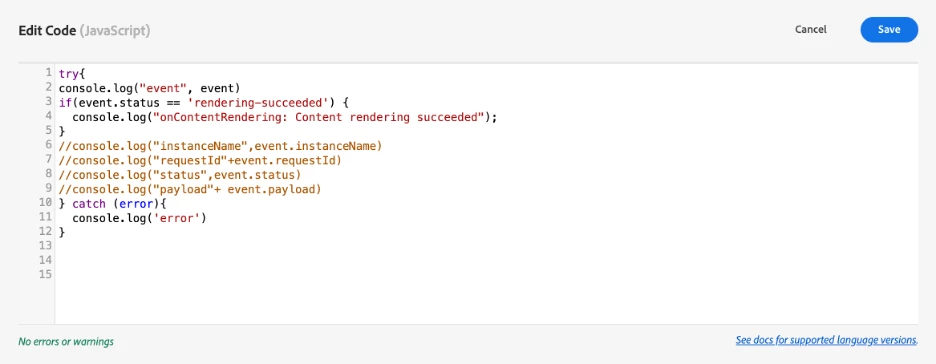 The next task we need to do is create an action for a rule. We’re going to create a core action, so create an action using the ‘Core’ extension and for action type select ‘Custom Code’. Finally open up the editor and we’re going to use some simple code to log a console statement upon a successful content rendering.