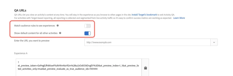 1. In Adobe Target UI, "Match Audience rules to see experiences" should be disabled